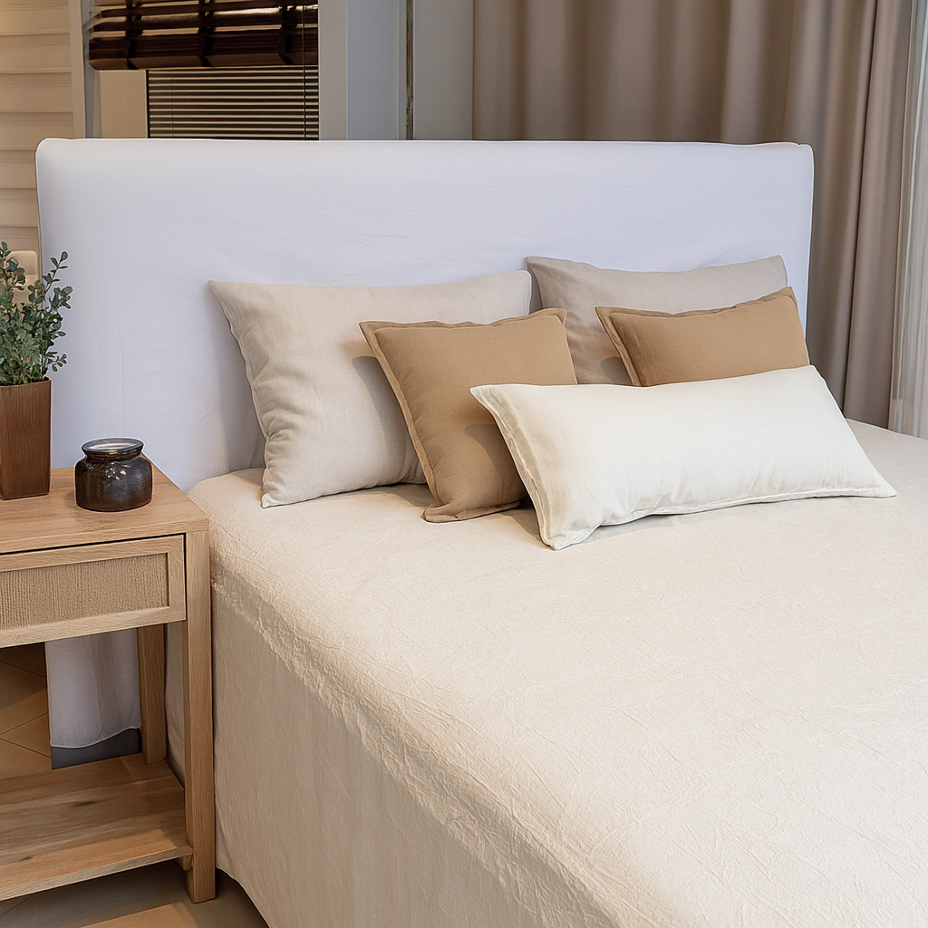 Confeccionada en tusor 100% algodón, aporta un look natural y rústico a tu dormitorio. Se adapta fácilmente gracias a su sistema de tiras que se atan por detrás del respaldo, permitiendo ajustarla de manera práctica a diferentes anchos.