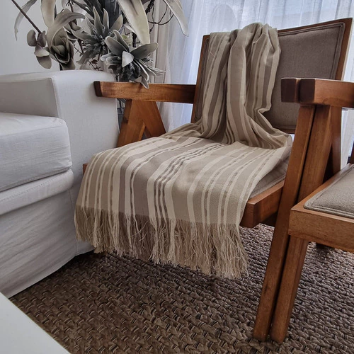 La Manta Cartagena está confeccionada en 100% algodón, con un diseño rayado en tonos beige. Liviana y fresca, con terminación en flecos y dobladillo, es ideal para el verano.